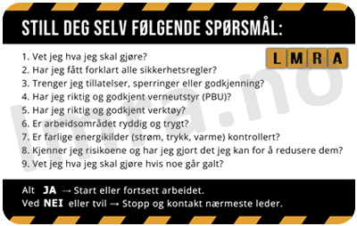 Å gjennomføre en LMRA (Last Minute Risiko Analyse) er viktig for å kartlegge eksisterende risikoer og for å kontrollere om det er tatt tilstrekkelige tiltak for å redusere risikoene.